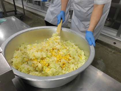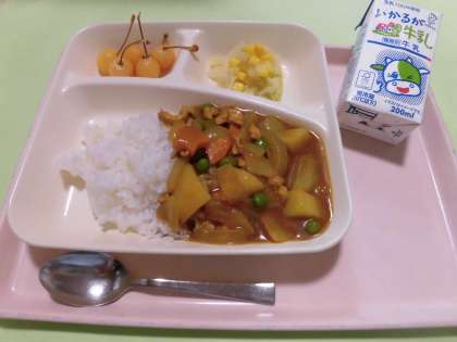 ・チキンカレーライス ・キャベツとコーンのサラダ ・さくらんぼ(缶) ・牛乳 です。