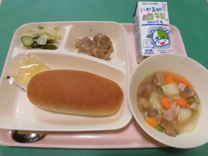 ・鶏肉のバジル焼き ・ベーコンと野菜のスープ煮 ・キャベツときゅうりのサラダ ・コッペパン ・マーマレード ・牛乳 です。