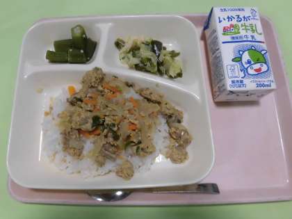 ・他人丼 ・ささみと野菜のいためもの ・オクラの甘酢あえ ・牛乳 です。