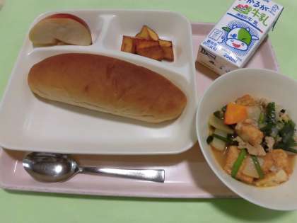 ・中華煮 ・大学いも ・りんご ・黒糖パン ・牛乳 です。