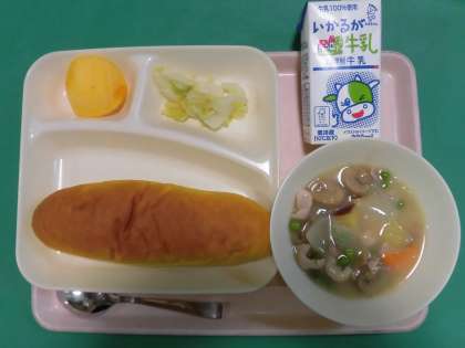 ・鶏肉とさつまいものシチュー ・はくさいのピクルス ・かき(平核無柿) ・パンプキンパン ・牛乳 です。