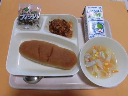 ・なすのミートグラタン ・鶏肉とキャベツのスープ ・ミニフィッシュ ・黒糖パン ・牛乳 です。