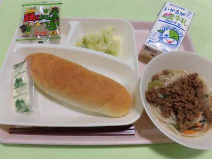 ・タンタンめん【肉みそ・汁めん】 ・あっさりキャベツ ・豆こんぶ ・コッペパン ・ソフトマーガリン ・牛乳 です。