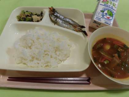 ・焼きししゃも ・さといもの和風カレー汁 ・ささみとこまつなのいためもの ・ごはん ・牛乳 です。