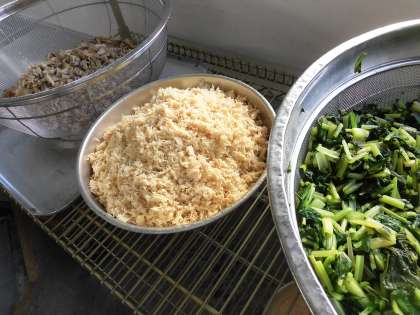 「ささみとこまつなのいためもの」には、ささみ、こまつな、まいたけを使っています。