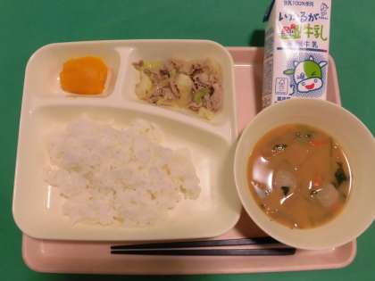 。豚肉と野菜のいためもの ・いわしのつみれ汁 ・かぼちゃういろう ・ごはん ・牛乳 です。