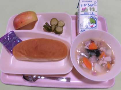 ・鶏肉ときのこのシチュー ・きゅうりのピクルス ・りんご ・コッペパン ・ブルーベリージャム ・牛乳 です。