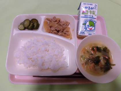 ・豚肉のコチジャンいため ・鶏肉とはるさめのスープ ・きゅうりのナムル ・ごはん ・牛乳 です。