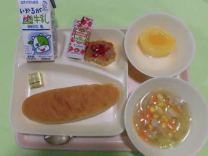 ・ツナポテトオムレツ【ケチャップ】 ・スープ ・白桃(缶) ・コッペパン ・バター ・牛乳 です。