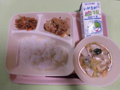 ・鶏肉の梅風味焼き ・うすくず汁 ・きんぴらごぼう ・ごはん ・牛乳 です。