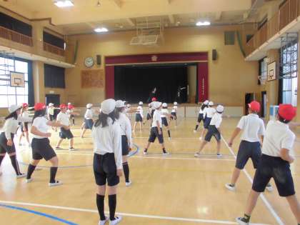 5年生は2時間目に講堂でダンスの出前授業を受けました。ウォーミングアップに足でじゃんけんをしました。