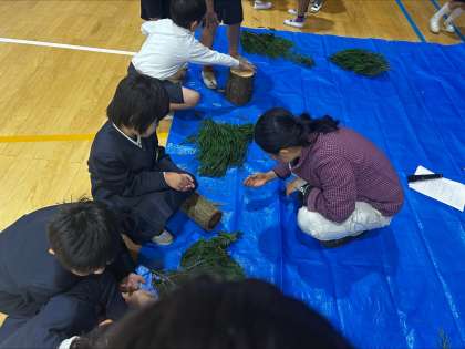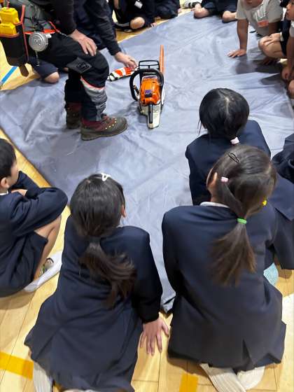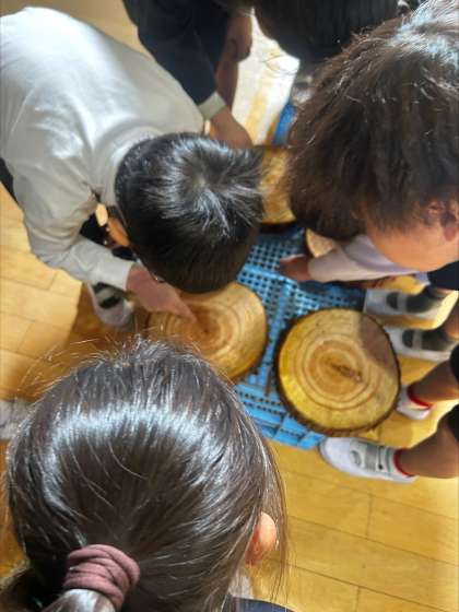 昨日は、南河内林業の方に来ていただき、「林業ってどんな仕事?」や実際のスギやヒノキの原木を見たり触ったりして、山や森などの自然を身近に感じる体験をしました。年輪を数えたり、木を切るチェーンソーを見たり、子どもたちは、初めての体験にわくわくしながら学んでいました。学校で使っている机やいす、体育館の床も木を使っていることに改めて気づき、林業をされている方への感謝の気持ち、自然を大切にしていこうという気持ちが芽生えました。