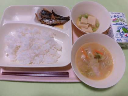 ・いわしのしょうが煮 ・みそ汁 ・高野どうふの煮もの ・ごはん ・牛乳 です。