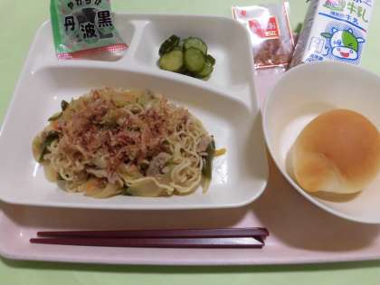 ・和風焼きそば【かつおぶし】 ・きゅうりのしょうがづけ ・ソフト黒豆 ・ミニコッペパン ・牛乳 です。