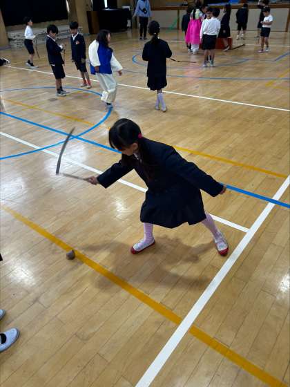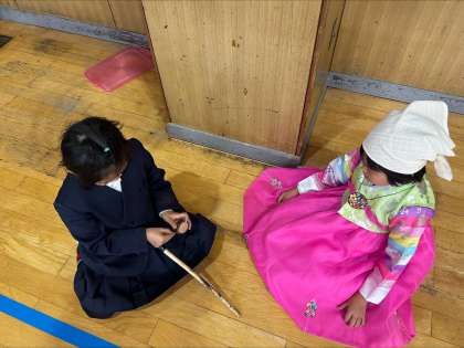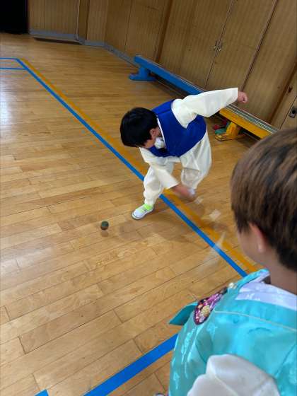 その後、韓国・朝鮮の遊びである、「ペンイ」という駒回しにチャレンジしました。民族学級在籍児童は、何度か遊んだことがあるため、初めて挑戦する友だちに教える姿が見られました。楽しそうに取り組んでいました。