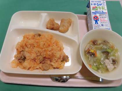 ・ケチャップライス ・スープ ・れんこんフライ ・牛乳 です。