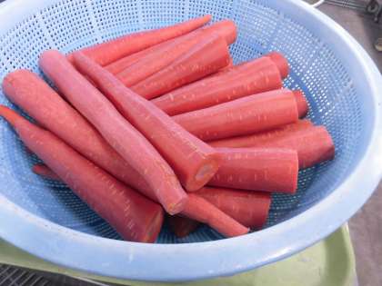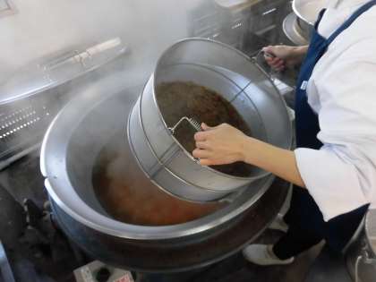 今日の「ぞう煮」は、1年で1度だけ、かつおぶしでとっています。関西風の白みそを使った「ぞう煮」です。なにわの伝統野菜の一つである、金時にんじんを使っています。