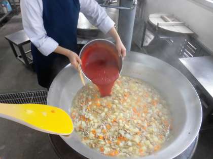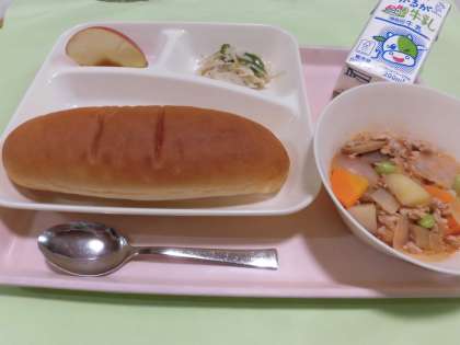 ・ケチャップ煮 ・ささみと野菜のソテー ・りんご ・黒糖パン ・牛乳 です。
