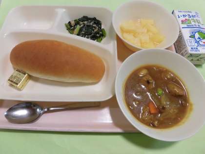 ・ミートボールと野菜のカレー煮 ・ツナとこまつなのソテー ・パインアップル(カット缶) ・コッペパン ・バター ・牛乳 です。