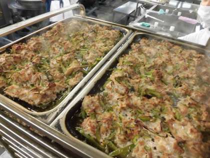 オイスターソースは、貝のかきから作ったソースです。旨みがぎゅっと凝縮されたそーすで、中華料理によく使われます。豚肉にしょうが汁、にんにく、オイスターソース、こいくちしょうゆ、綿実油で下味をつけて、ピーマンを混ぜて焼き物機で焼いています。