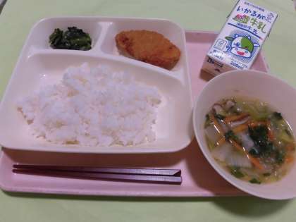 ・たらフライ ・うすくず汁 ・こまつなのごまあえ ・ごはん ・牛乳 です。