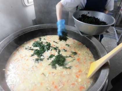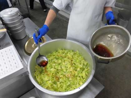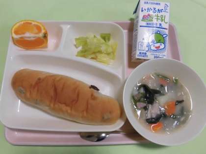 ・鶏肉とほうれんそうのシチュー ・キャベツのサラダ ・デコポン ・レーズンパン ・牛乳 です。