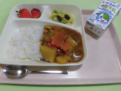 ・チキンカレーライス ・ビーンズサラダ ・いちご ・牛乳 です。