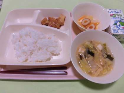・鶏肉の八丁みそだれかけ ・五目汁 ・ちくわとだいこんのいため煮 ・ごはん ・牛乳 です。