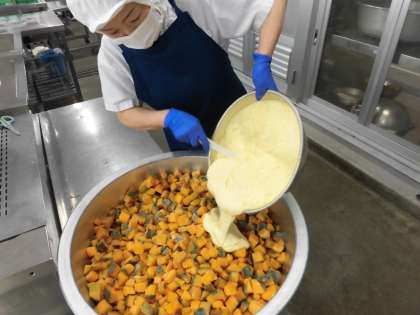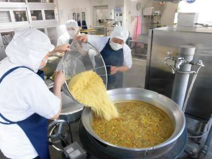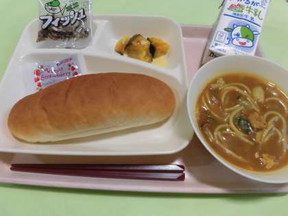 ・コッペパン ・牛乳 ・カレースープスパゲッティ ・かぼちゃのマリネ焼き ・ミニフィッシュ ・いちごジャム です。