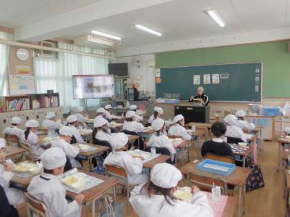 大型TVに映し出された映像を見ながら、真似をしながら給食を上手に食べることができるようにしています。