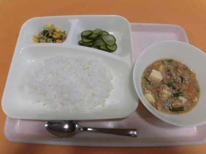 ・ごはん ・牛乳 ・マーボーどうふ ・きゅうりの中華あえ ・ツナとチンゲンサイのいためもの です。