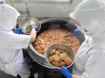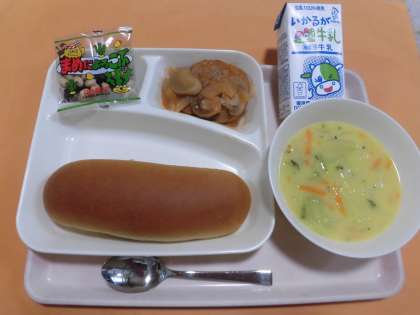 ・黒糖パン ・牛乳 ・煮こみハンバーグ ・コーンスープ ・豆こんぶ です。
