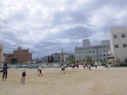 少し暑くなってきましたが、水分補給をしながらも、運動場いっぱいに走り回っていました。ドッヂボールをしている子どもたちもいました。