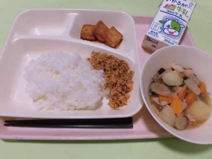 ・ごはん ・牛乳 ・鶏肉とじゃがいもの煮もの ・あつあげのしょうゆだれかけ ・紅ざけそぼろ です。
