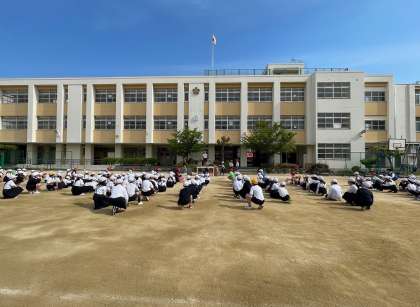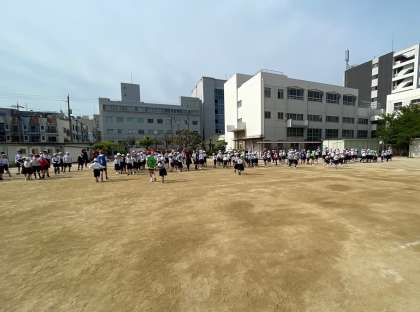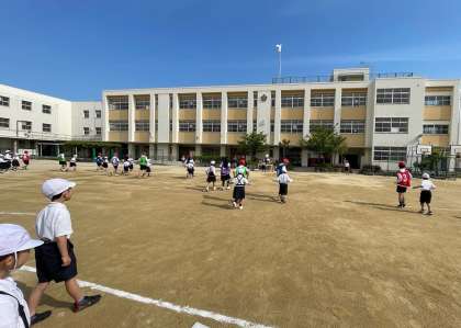 他学年がグループになって列車を作り、コーンの周りを元気よく走りました