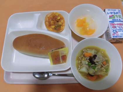 ・コッペパン ・牛乳 ・豚肉と野菜のカレースープ煮 ・変わりピザ ・ミックスフルーツ(缶) ・アプリコットジャム です。