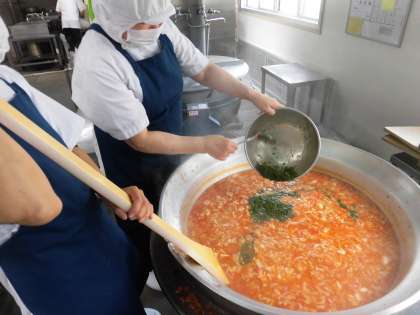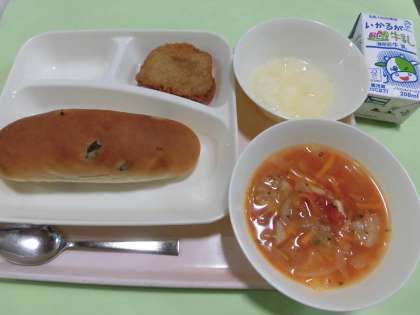 ・レーズンパン ・牛乳 ・トンカツ ・ミネストローネ ・和なし(カット缶)  です。