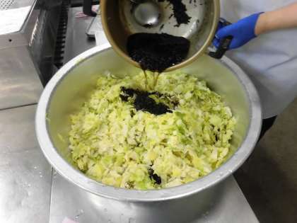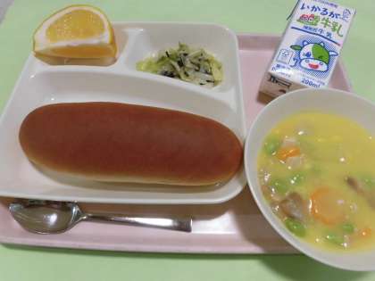 ・黒糖パン ・牛乳 ・鶏肉とコーンのシチュー ・キャベツのひじきドレッシング ・かわちばんかん  です。