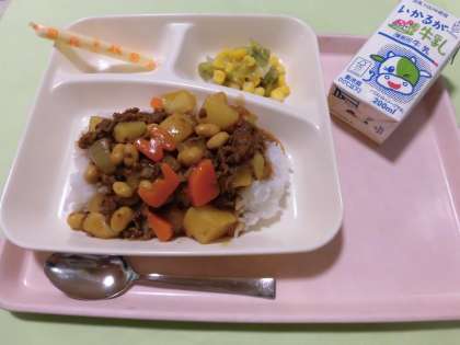 ・牛肉と大豆のカレーライス ・レタスとコーンのサラダ ・棒チーズ ・牛乳 です。
