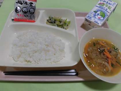 ・マーボーはるさめ ・チンゲンサイともやしの甘酢あえ ・いり黒豆 ・ごはん ・牛乳  です。