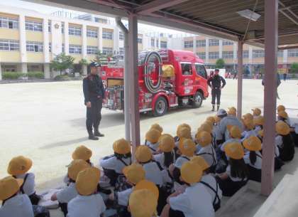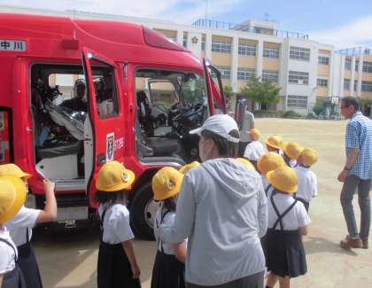 運動場では、消防署の方から、消防車についての説明がありました。子どもたちは、消防車のそばに行って見学しました。