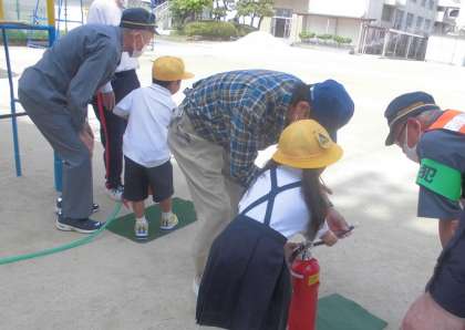 消防署と地域の方による、水消火器を使って、消火器の使い方について学びました。実際に子どもたちは、水消火器を使った消火活動体験をしました。