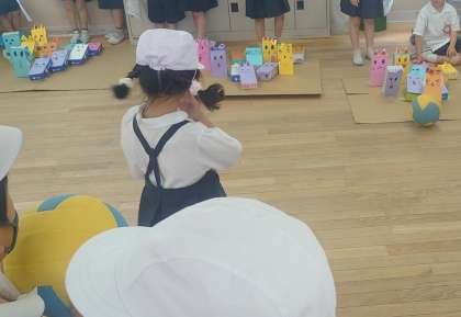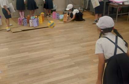 箱で作ったボーリングのピンを何本倒すことができるかな。