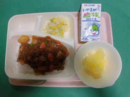 ・ハヤシライス ・キャベツとコーンのサラダ ・りんご(カット缶) ・牛乳 です。