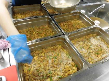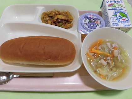 ・カレーマカロニグラタン ・てぼ豆のスープ ・ぶどうゼリー ・黒糖パン ・牛乳 です。