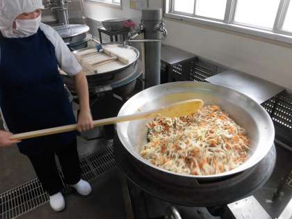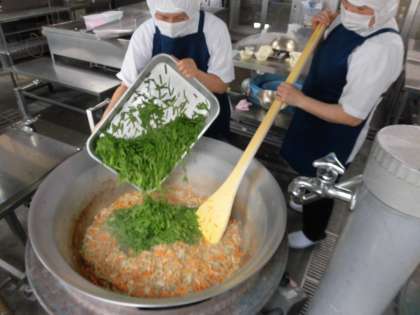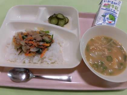 ・豚ひき肉とにらのそぼろ丼 ・みそ汁 ・きゅうりのゆず風味 ・牛乳  です。