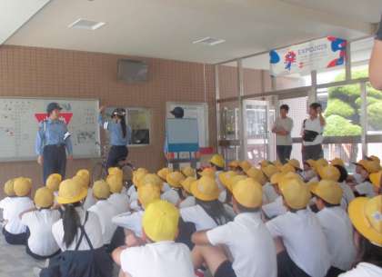 4時間目に5年生と6年生は、警察署交通課の人から自転車走行について話を聞きました。その後、運動場で交通課の人の指導による自転車走行練習を実際に体験しました。しました。