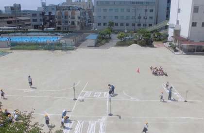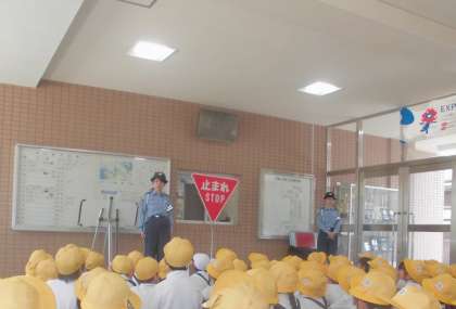 2時間目に1年生と2年生は、警察署交通課の人の安全な歩行の仕方についてお話を聞きました。その後、運動場で、1年生2年生は、交通課の人の指導による安全な歩行の練習を実際に体験しました。