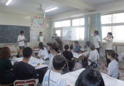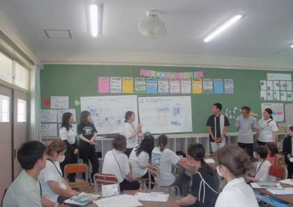 はじめに、授業者の松井先生から今日の授業やこの日までの取組について話がありました。その後、各班に分かれて、今日の授業で、成果と課題、質問事項を色分けした付箋に書き込み、シートに貼っていきました。それぞれの内容ごとにまとめ、各班ごとに成果と課題を発表しました。