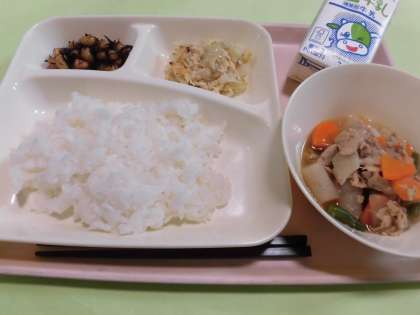 ・豚肉と野菜の煮もの ・ひじき豆 ・ささみとキャベツのごまみそ焼き ・ごはん ・牛乳 です。